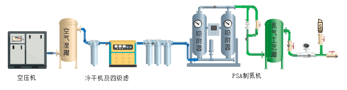 空壓機→空氣緩沖罐(濕罐)→C級過濾器→冷凍式干燥機→T級過濾器→A級過濾器→H級過濾器→制氮機主機→氮氣流量,純度,壓力檢測→氮氣儲氣罐→使用點
